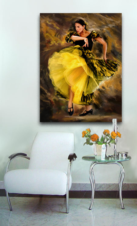 Das Bild der Flamenco Tänzerin ist ein hochwertiger Kunstdruck auf echter Leinwand, aufgespannt auf einen massiven Holz-Keilrahmen. Sie können es in unterschiedlichen Größen und als günstiges Set mit Bilderrahmen bestellen.